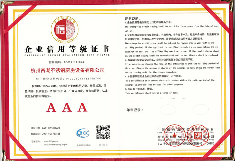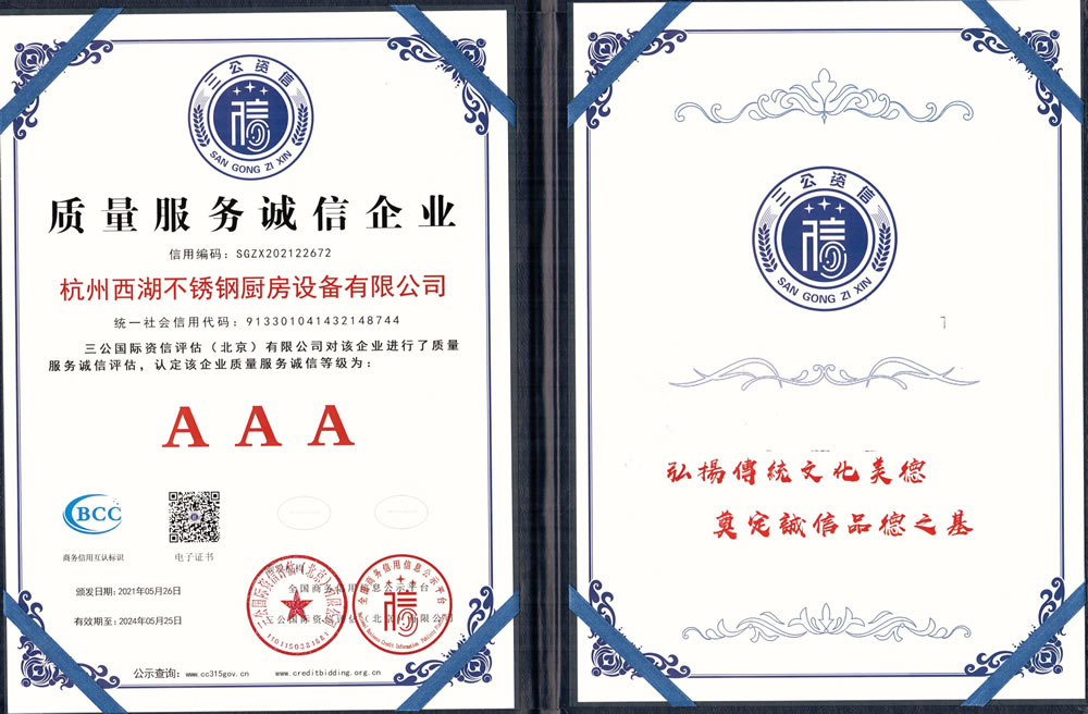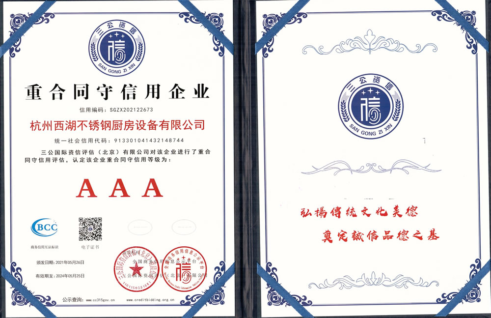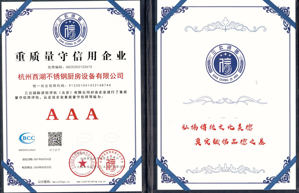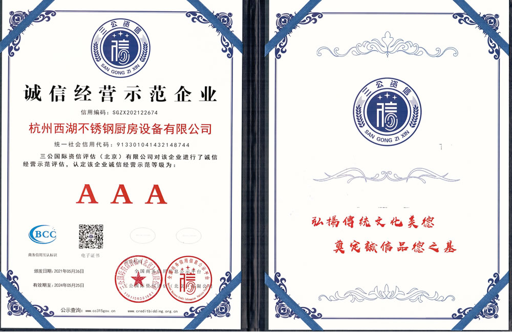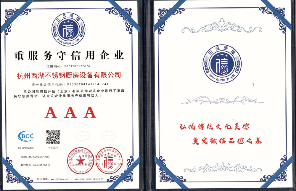 杭州西湖不銹鋼廚房設(shè)備有限公司成立20年以來(lái),通過(guò)一系列創(chuàng)造性的工作,凝聚企業(yè)力量,發(fā)揮自身優(yōu)勢(shì),助推企業(yè)發(fā)展和品牌建設(shè),取得了一些榮譽(yù),這是廣大西湖員工共同努力和各位新老客戶共同支持的結(jié)果,我們將再接再厲創(chuàng)造更多的輝煌!